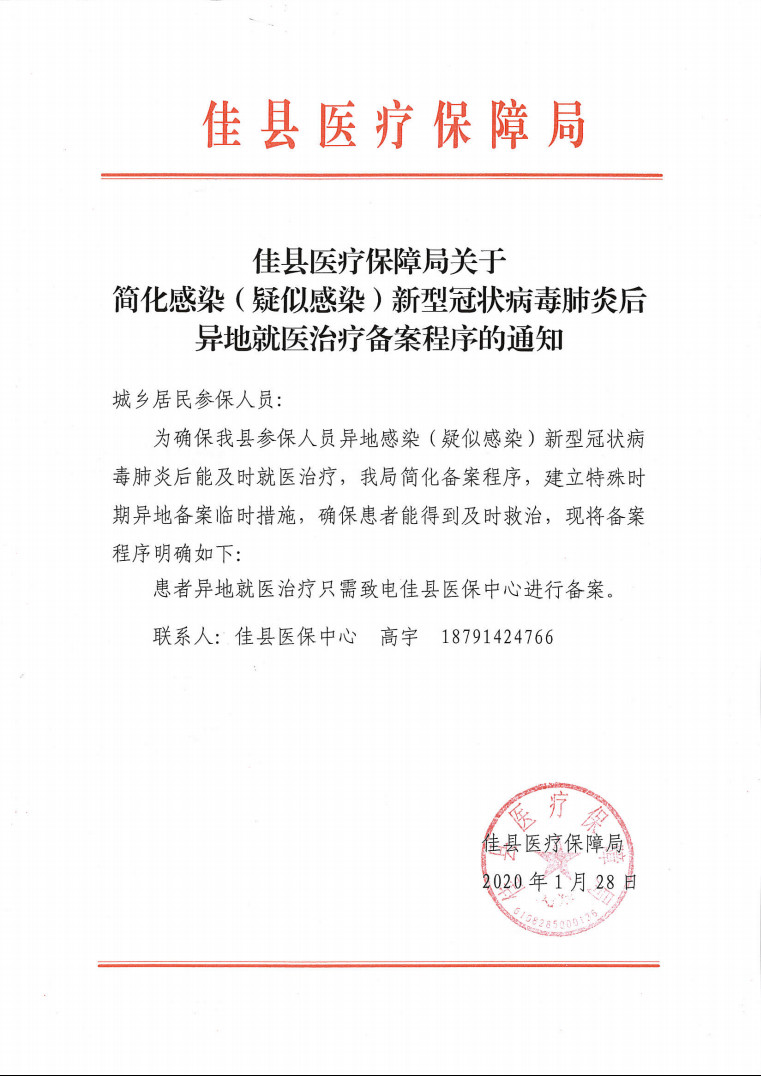 佳縣醫保局關(guān)于新型冠狀病毒肺炎的通知